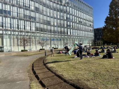 芝生の上でお弁当を食べています。日差しが程よく気持ちのいい気候です。