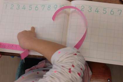 算数科の学習では、紙テープを使って机の縦と横を比べました。