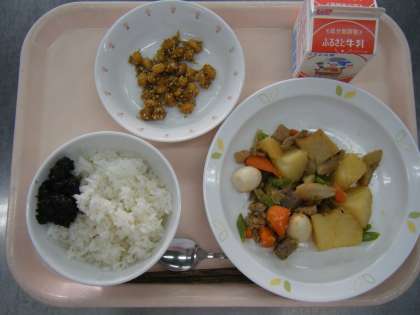今日の給食は、麦ごはん、牛乳、のりの佃煮、いりどり煮、大豆とじゃこの甘辛あげです。