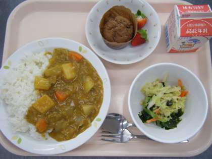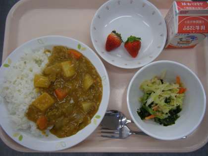 今日の給食は、カレーライス、牛乳、和風サラダ、くだもの(いちご)です。