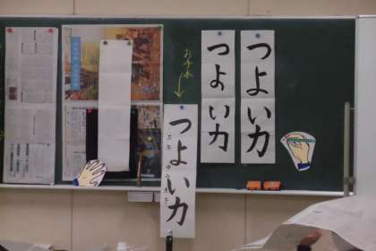 普段は、机の上で筆を持って行いますが、今日は床に新聞紙を敷いて練習をしました。