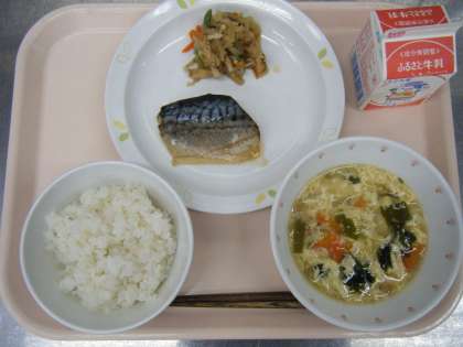 今日の給食は、麦ごはん、牛乳、魚の塩焼き、切り干し大根の煮つけ、かきたま汁です。