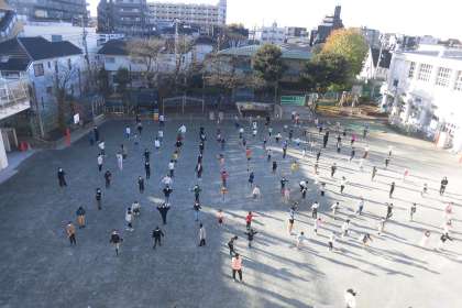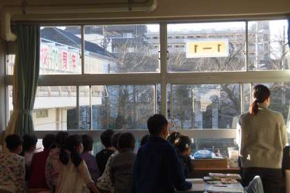 1年生の教室では、窓の外の校庭の様子を見学しています。