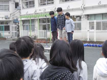 今朝は、校長先生の話の後・・・週番の先生から、“あいさつの大切さ”について話があり・・・給食・保健委員会から・・・“学校給食の歴史や栄養士さん、調理員さんが日々、工夫していること”等の発表がありました。