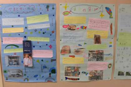 廊下には、「まちたんけん」で担当したお店や公共施設等の紹介が掲示してあります。