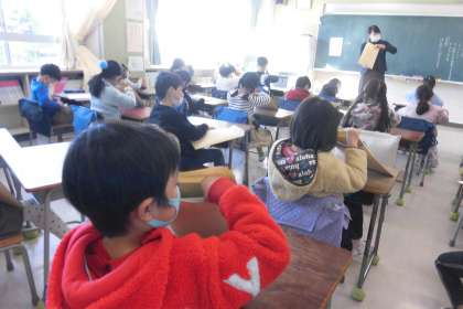 冬休みの課題やお知らせが入った袋の中身を確認しています。