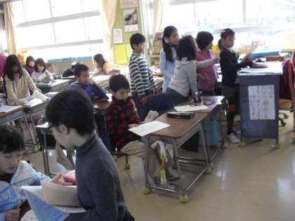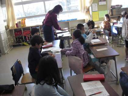 朝自習のようすです。算数プリントの答え合わせ・・・