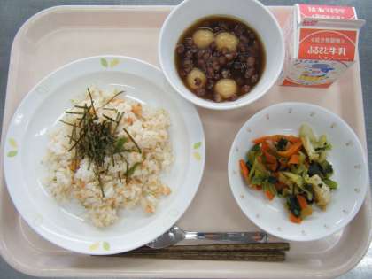 今日の給食は、あけぼのずし、牛乳、小松菜の煮びたし、白玉しるこです。