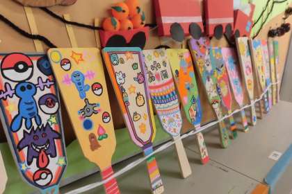 今年度は新たに子どもたちが描いた羽子板が新BOP室前の廊下に展示してあります。
