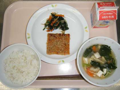 今日の給食は、麦ごはん、牛乳、松風焼き、ほうれん草の磯あえ、吉野汁です。