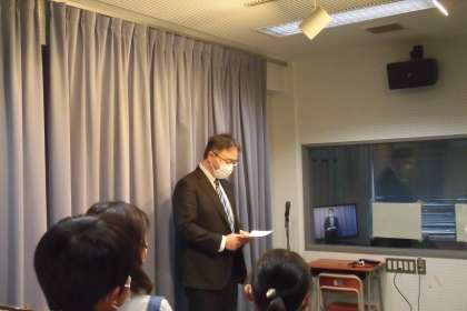 本日は、雨上がりのためテレビ放送での朝会が行われました。