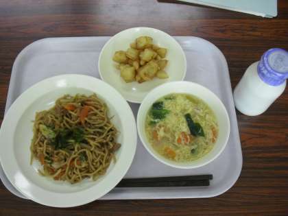 今日の献立は、焼きそば、牛乳、たまごスープ、ビーンズポテトです。今日も調理員さんがアレルギー対応食を作りました。