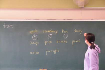 先生の発音や黒板に描かれた絵を頼りにみんなでフルーツの名前を確認しました。