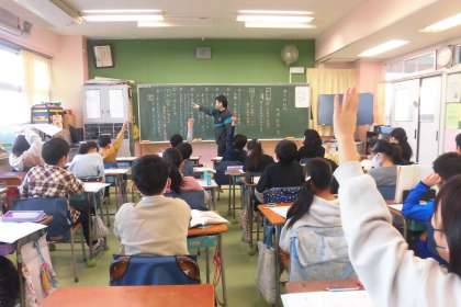 多くの子どもたちが自分の意見を挙手して発言をしています。