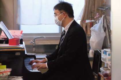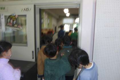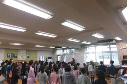 合唱団の歌声が聴こえてくると、登校した児童たちが、音楽室の入り口で多くの子どもたちが見学をしています。