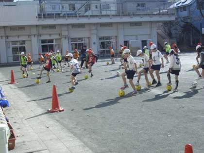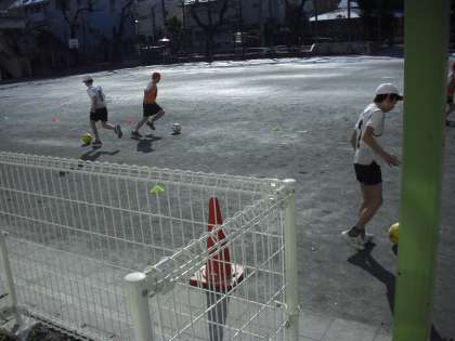 “体育:ボール運動・・サッカーゲーム”基本のドリブルの練習風景です。