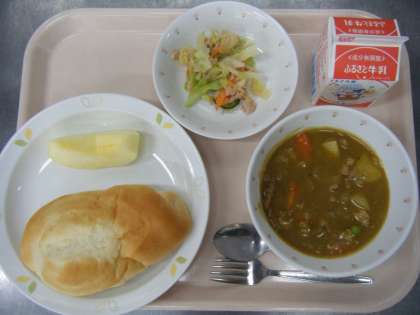 今日の給食は、ソフトフランスパン、牛乳、ツナサラダ、カレーシチュー、くだもの(りんご)です。