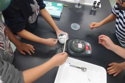 そして、電子ばかりの使い方や実験器具(シャーレや計量スプーンなど)の名前を確認し、実験を行いました。