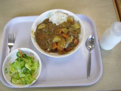 今日の献立は、カレーライス、牛乳、福神漬け、野菜の甘酢かけです。