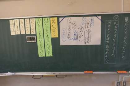 担任の先生が、各グループの子どもたちの声を価値付け、その言葉が子どもたちの励みつながり、日頃からの先生と子どもたちとの関係の良さも感じられる授業でした。