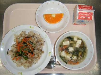 今日の給食は、ビビンバ、牛乳、春雨スープ、くだもの(津のかがやき)です。