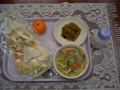 今日のメニューは、ドライカレーサンド、牛乳、ヌードルスープ、くだものです。