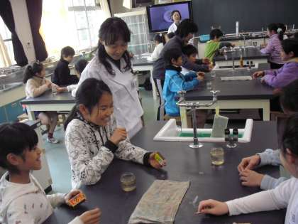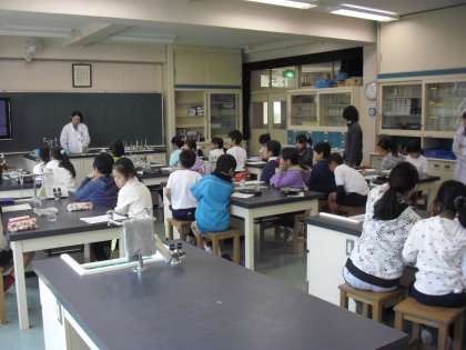 4時間目に八幡中学校の理科の先生2名が4年生に正しい実験をするための基本的な器具など使い方を教えてくれました。