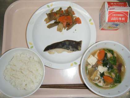 今日の給食は、麦ごはん、牛乳、魚の西京焼き、くきわかめの炒め煮、けんちん汁です。