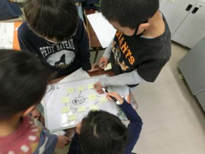 3年1組では、国語科の学習をしています。「楽しい」という言葉からどんなイメージがわくかマッピングをしていきました。最初に個人で学習をして、次にグループでホワイトボードを使って考えを整理していきました。グループで話し合うことで、自分の考え以上のことが広がっていきました。3年1組の子どもたちもとても仲が良く、昼休みはクラス遊びで「どろけい」をしていました。冬の寒い日でもみんなで体を動かし、とても気持ちの良い表情で5時間目をスタートしました。担任の先生は、見やすい黒板と掲示物に心掛け、授業の準備をしています。一人一人の考えが生かされるよう、授業の中でもグループでの活動を多く取り入れ、子どもたちは楽しみながら学習に取り組むことができました。