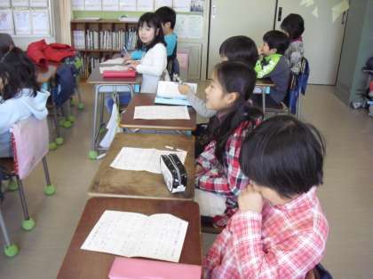 朝の会の司会は、日直さん・・・朝の会のリーダーです。クラスのみんなもリーダーの進行に協力して・・・・真剣に聞いています。
