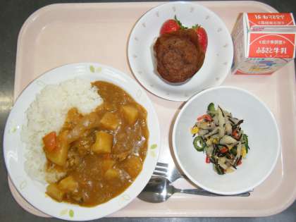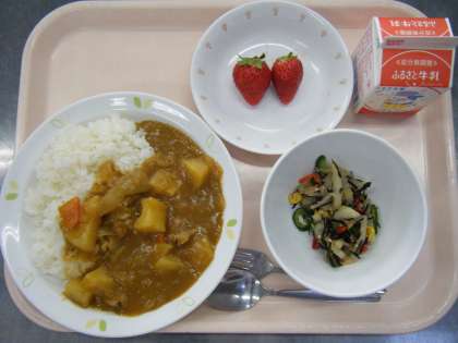 今日の給食は、カレーライス、牛乳、大根とひじきのサラダ、くだもの(いちご)です。