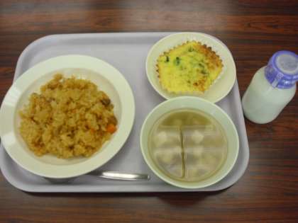 今日の献立は、チキンライス、牛乳、きのこスープ、洋風卵焼きです。