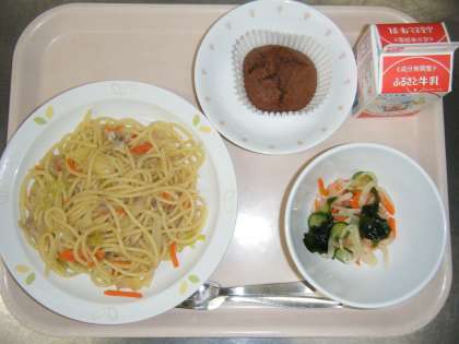 今日の給食は、キャベツとツナのスパゲッティ、牛乳、わかめサラダ、ココアマフィンです。