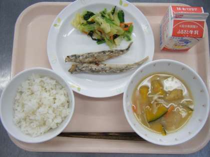 今日の給食は、麦ごはん、牛乳、ししゃもの唐揚げ、野菜のごま風味、かぼちゃのみそ汁です。