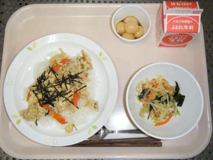 今日の給食は、親子丼、牛乳、わかめと野菜の和えもの、みたらし団子です。