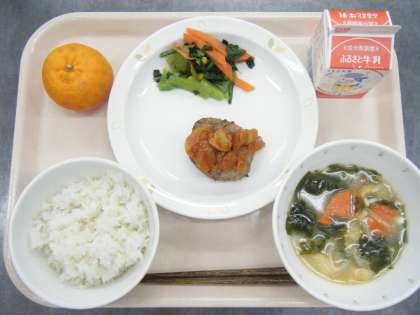 今日の給食は、麦ごはん、牛乳、ハンバーグ、青菜のソテー、みそ汁、くだもの(ぽんかん)です。