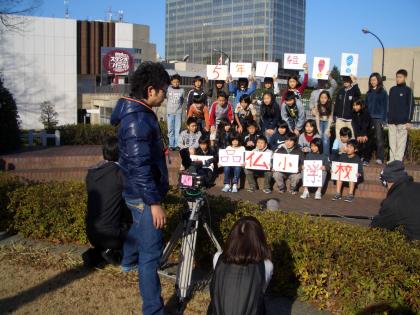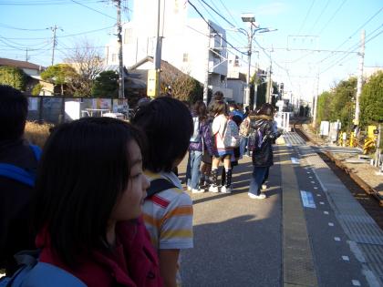 右画面は、九品仏駅のホームで電車を待つ様子です。3列にきちんと並んで待っています。