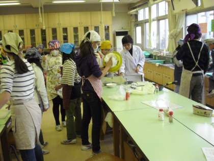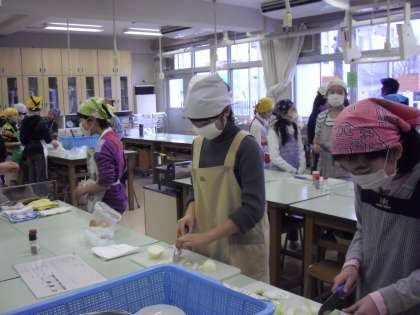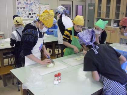 専科授業:家庭科・・・調理実習“マッシュポテト作り”・・・包丁をもって、玉ねぎやじゃが芋等を・・・・女の子も男の子もみんな上手でした。