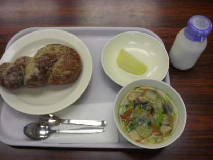 今日の献立は、あげパン、牛乳、白菜と鶏団子のスープ、くだものです。