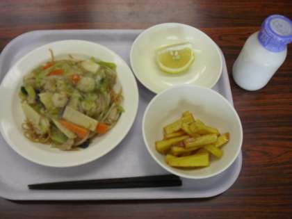 今日の献立は、上海面、牛乳、キャンディポテト、くだものです。