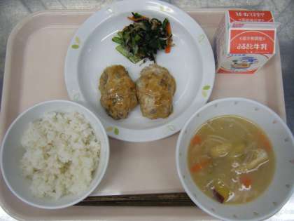 今日の給食は、麦ごはん、牛乳、豆腐入りさくさくつくね、小松菜の磯あえ、みそ汁です。