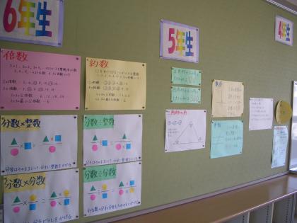 少人数指導「算数科」を2年生から6年生まで行っています。画面は、子どもたちに覚えてほしい基礎的・基本的な事項を分かりやすく掲示してありました。