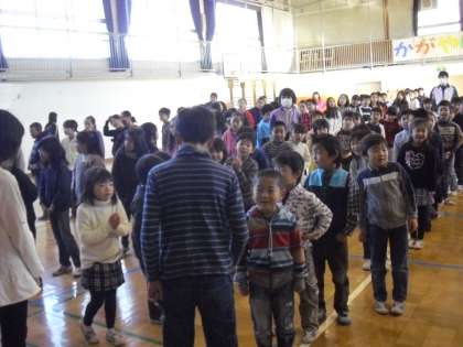 今朝は、児童集会で・・・“伝言ゲーム”をしました。1年生には、“鈴木 福:芦田愛”という題でゲームが始まりました。