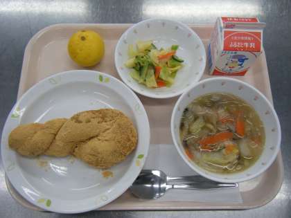 今日の給食は、きなこあげパン、牛乳、野菜のドレッシングかけ、肉だんご入り春雨スープ、くだもの(湘南ゴールド)です。