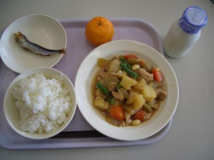 今日のメニューは、ごはん、牛乳、いわしの丸干し、豆いり筑前煮、くだものです。
