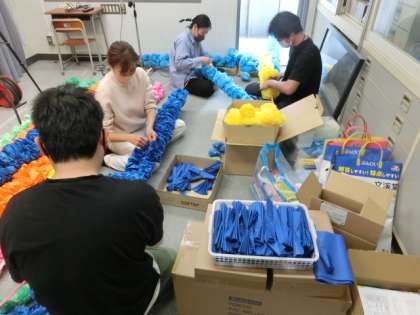 放送室で、子どもたちが作った紙花を3・4年生の先生方がアーチにつけています。