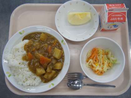 今日の給食は、カレーライス、牛乳、コールスローサラダ、くだもの(りんご)です。