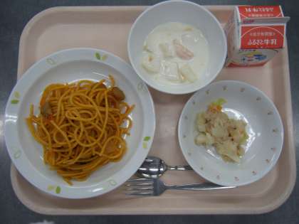 今日の給食は、スパゲッティナポリタン、牛乳、ツナサラダ、フルーツヨーグルトです。