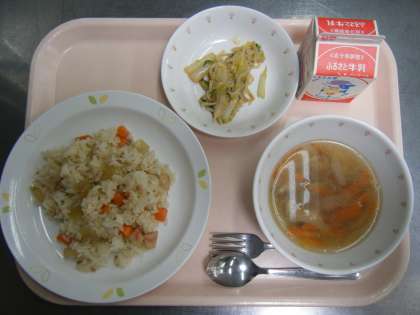 今日の給食は、チャーハン、牛乳、白菜の中華サラダ、春雨スープです。