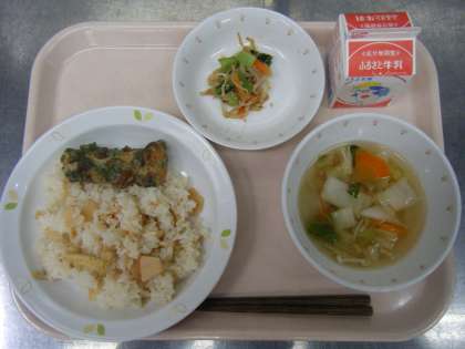 今日の給食は、たけのこごはん、牛乳、ちくわの磯辺揚げ、野菜のごまあえ、白菜汁です。